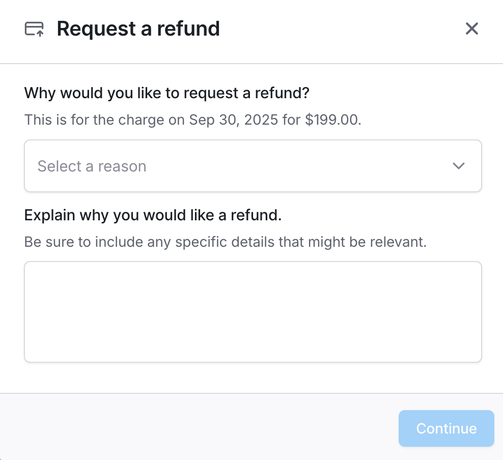 - Fill the Request a refund form with details for the refund and click Continue: