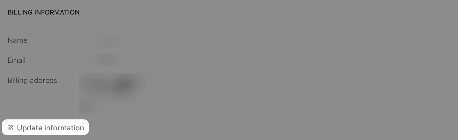- On Billing, click Manage billing information. This will open Stripe's portal where you can view payment methods, billing information, invoicing history, and update your billing information. Then, click Update information.