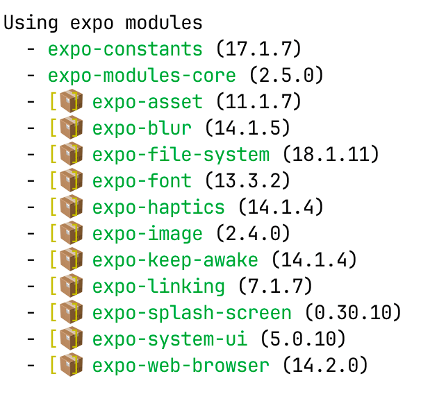 For example, after creating a project with SDK 53's default template, and running the npx expo run:android command, you will notice the [📦 package-name prefix next to packages that are precompiled: