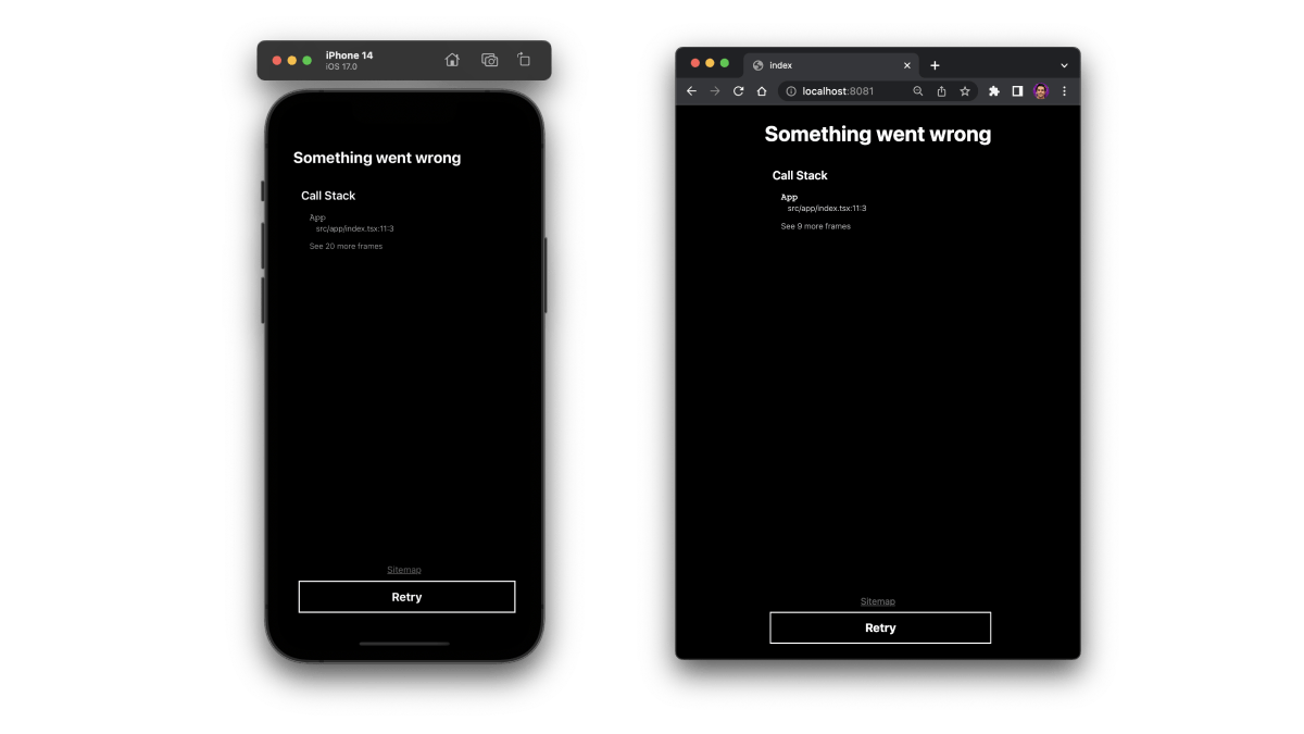 import { View, Text } from 'react-native'; import { type ErrorBoundaryProps } from 'expo-router'; export function ErrorBoundary({ error, retry }: ErrorBoundaryProps) { return ( <View style={{ flex: 1, backgroundColor: "red" }}> <Text>{error.message}</Text> <Text onPress={retry}>Try Again?</Text> </View> ); } export default function Page() { ... }
