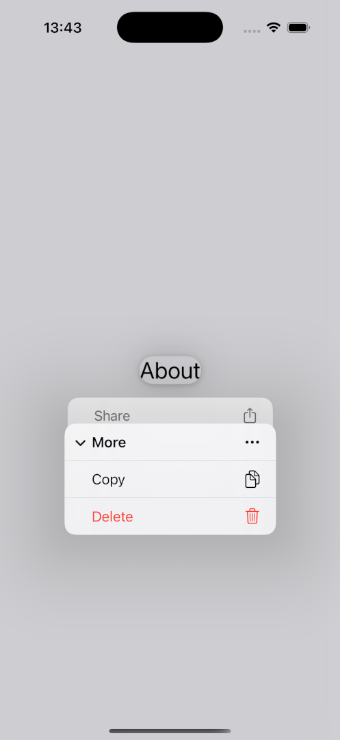 <Link href="..."> <Link.Trigger>About</Link.Trigger> <Link.Menu> <Link.MenuAction title="Share" icon="square.and.arrow.up" onPress={() => {}} /> <Link.Menu title="More" icon="ellipsis"> <Link.MenuAction title="Copy" icon="doc.on.doc" onPress={() => {}} /> <Link.MenuAction title="Delete" icon="trash" destructive onPress={() => {}} /> </Link.Menu> </Link.Menu> </Link>